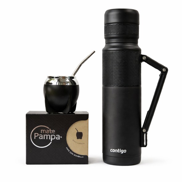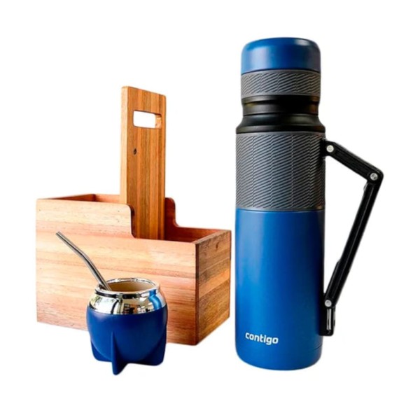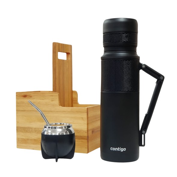 1 Termo Contigo 1.1 L, 1 Mate Pampa tradicional, 1 Bombilla, 1 Porta matero de madera, Asa retráctil |