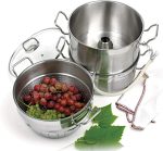 El exprimidor y vaporizador NORPRO #624 es una herramienta versátil ideal para extraer jugos naturales de frutas como uvas, manzanas, frambuesas, arándanos, duraznos y más. Fabricado en acero inoxidable duradero, este equipo utiliza el método de extracción al vapor, preservando el sabor y los nutrientes de las frutas. Perfecto para hacer jugos, jaleas, mermeladas y concentrados sin necesidad de prensado manual. Incluye múltiples compartimientos apilables, manguera de drenaje con pinza y tapa de acero. Ideal para cocinas caseras o pequeñas producciones artesanales. Internacionalmente conocido como Norpro Stainless Steel Steamer Juicer #624.