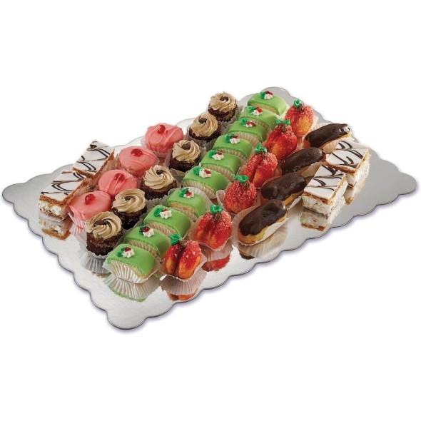 Las bandejas rectangulares Wilton de 33 x 48,2 cm son perfectas para la presentación y el transporte de tortas grandes, pasteles decorados o tortas de varias capas. Están fabricadas en cartón grueso de alta calidad, con superficie plateada apta para alimentos, que brinda soporte y estilo profesional. Son ideales para eventos especiales, cumpleaños o trabajos de repostería personalizada. Pueden usarse como base decorativa o descartable para facilitar la entrega de tus creaciones. Internacionalmente conocido como Wilton Cake Boards Rectangular 33 x 48.2 cm.