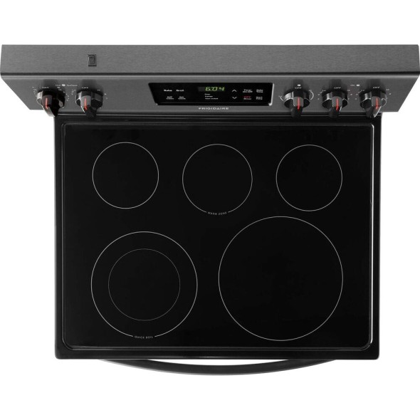 La Cocina Eléctrica Frigidaire FCRE3052AB en negro ofrece máxima eficiencia y estilo contemporáneo. Su amplia superficie de cocción con 5 zonas de vidrio cerámico te permite cocinar múltiples recetas simultáneamente, mientras que el potente quemador de 3,000 W “Quick Boil” acelera el hervor de agua y líquidos.