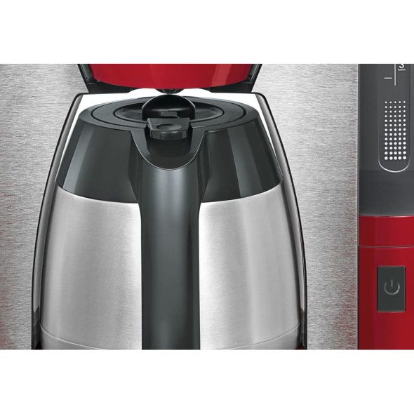 La cafetera eléctrica Bosch TKA6A684 ComfortLine en color rojo te ofrece café con el mejor aroma y estilo. Su diseño moderno con jarra térmica de acero inoxidable conserva el calor por más tiempo sin necesidad de placa calefactora. Incorpora la función Sensor Aroma+ que ajusta la intensidad del café según tus preferencias, sistema antigoteo, apagado automático y depósito de agua extraíble. Ideal para preparar entre 8 a 12 tazas de café, perfecta para hogares exigentes o espacios de oficina. Internacionalmente conocida como Bosch Coffee Maker Red.