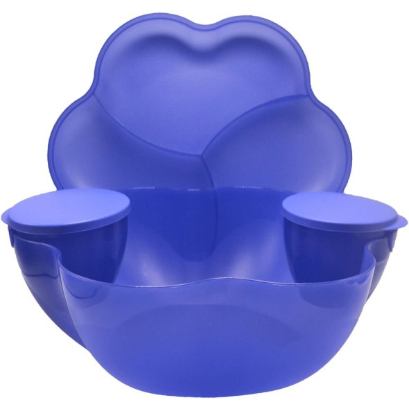 Organiza y conserva tus alimentos con estilo con el Set Tupperware Morado 4624A-1, compuesto por un bowl grande de 5,6 litros con tapa decorativa en forma de flor, y dos prácticos contenedores pequeños con tapa, todos en color morado a juego.