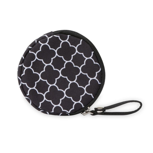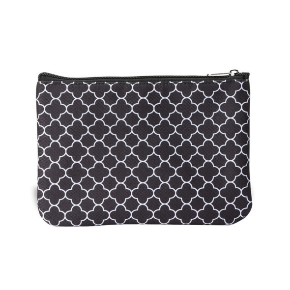 Incluye un cómodo cambiador portátil, dos estuches con cierre para accesorios pequeños y bolsillos exteriores para un acceso rápido. Su diseño en color negro con estampado geométrico blanco aporta estilo y funcionalidad en un solo producto.