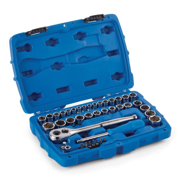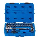 Todo el set viene organizado en un estuche rígido portátil, ideal para transporte, almacenamiento y uso en campo o taller. Su diseño compacto y funcional lo convierte en una opción excelente tanto para profesionales como para usuarios domésticos. También conocido como Mastercraft 41-Piece Socket & Ratchet Mechanics Tool Set – Complete and Durable.