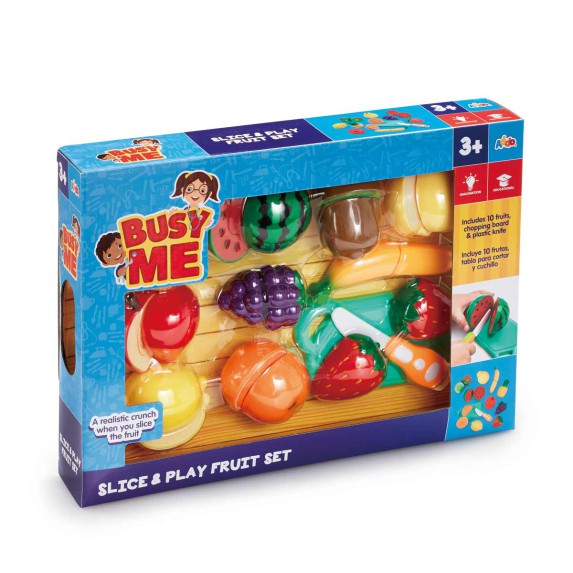 Perfecto para juegos de rol, este set estimula la creatividad, la coordinación mano-ojo y hábitos saludables desde temprana edad. Fabricado con materiales no tóxicos, duraderos y con bordes redondeados, es ideal para niños en edad preescolar. También conocido como Busy Me 10-Piece Fruit Cutting Play Set with Plastic Knife and Chopping Board for Kids.