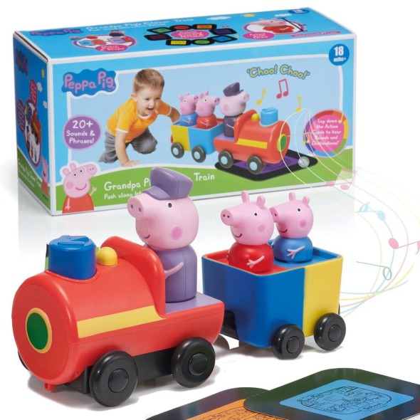 El set incluye al Abuelo Pig como conductor y a Peppa Pig y George como pasajeros, en vagones desmontables de colores brillantes. Su diseño robusto, colorido y de fácil manejo está pensado para fomentar la coordinación, la memoria y el aprendizaje temprano a través del juego interactivo. También conocido como Peppa Pig Grandpa Pig’s Clever Train with Sounds and Phrases.