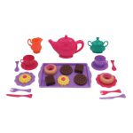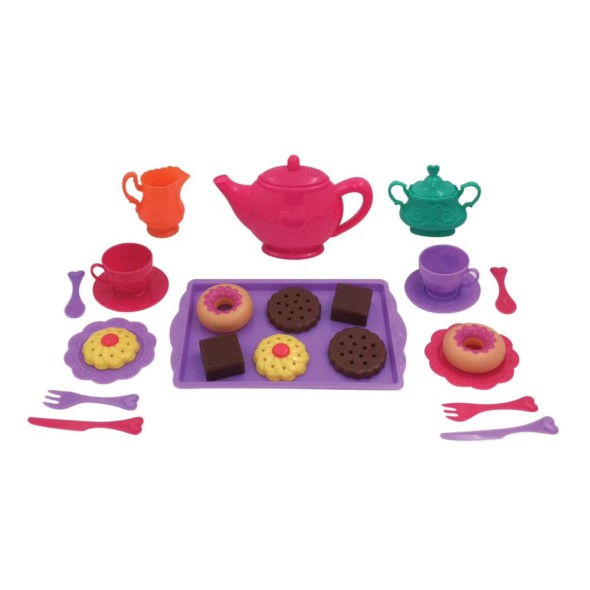 1 tetera con tapa, 4 tazas con platos, cucharitas, platitos para postre, rebanadas de pastel o cupcakes de juguete, etc