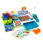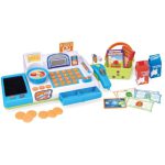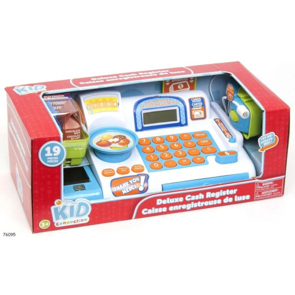 La Kid Connection Deluxe Caja Registradora de Juguete 19 Piezas es el set ideal para que los niños jueguen a ser cajeros y desarrollen su imaginación mientras aprenden sobre el valor del dinero y la interacción en las compras. Incluye una registradora con pantalla digital, teclado numérico, lector de tarjetas, micrófono simulado, balanza, escáner de mano y accesorios de supermercado.