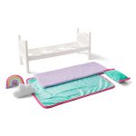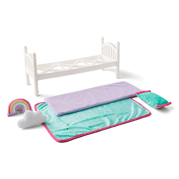 Incluye un acolchado color turquesa con detalles brillantes, una manta suave, una almohada en forma de nube y un cojín arcoíris, que añaden un toque divertido y lleno de color. Esta cama es compatible con muñecas de hasta 18 pulgadas (46 cm), fomentando la imaginación y el juego de roles.