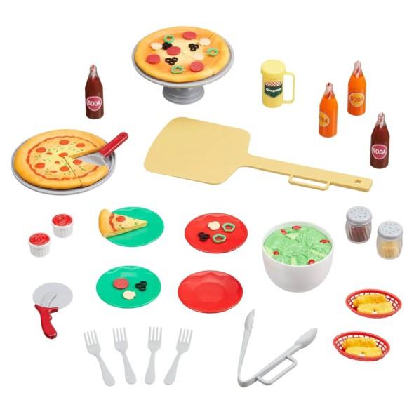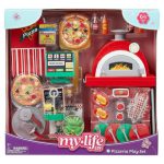 Incluye horno de pizza, mostrador, bandejas, ingredientes, cajas para llevar, utensilios, alimentos y más. Ideal para niñas y niños que aman los juegos de rol, los accesorios de cocina y las historias de negocio. También conocido como My Life As – Pizza Restaurant Playset 64 Pieces for 18” Dolls.