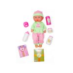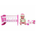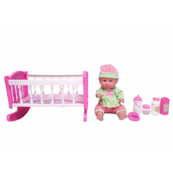 1 muñeca bebé, 1 cuna de plástico, ropa, accesorios |