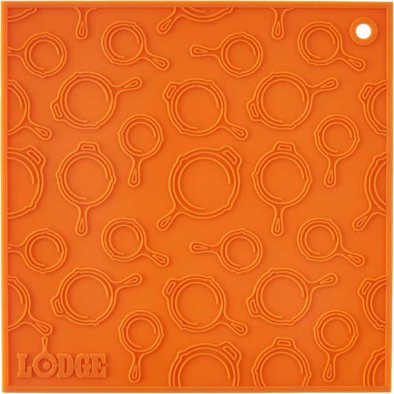 Su diseño cuadrado con relieve decorativo de sartenes tipo skillet no solo añade un toque visual atractivo, sino que mejora el agarre. También puede utilizarse como agarradera resistente al calor o abridor de frascos. También conocido como Lodge Orange Silicone Trivet AS7SKT61 – Heat-Resistant & Non-Slip Hot Pad.