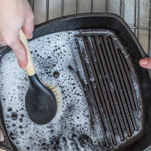 Lodge Cast Iron Scrub Brush – Wood Handle with Durable Nylon Bristles (Model SCRBRSHINT).