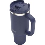 Fabricado con acero inoxidable de doble pared, mantiene el frío durante horas sin generar condensación externa. Su base angosta permite usarlo en la mayoría de los portavasos de autos, mientras que el mango facilita el transporte.