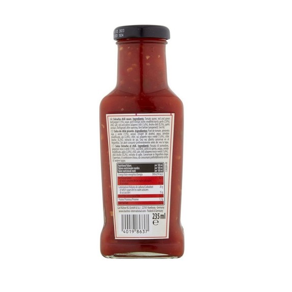 Elaborada en Alemania con ingredientes de alta calidad, se presenta en botella de vidrio de 235 ml, que conserva intacto su sabor y aroma hasta el último uso. También conocida comoKühne Sriracha Sauce with Ripe Chili and Garlic 235 ml.