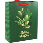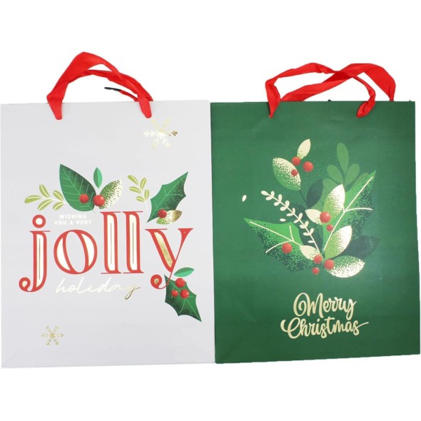El diseño incluye ilustraciones navideñas con hojas de acebo, frutos rojos y mensajes como “Jolly Holidays” y “Merry Christmas”, que resaltan con detalles metalizados. Perfecta para obsequios medianos como ropa, perfumes, cosméticos, accesorios o artículos decorativos.