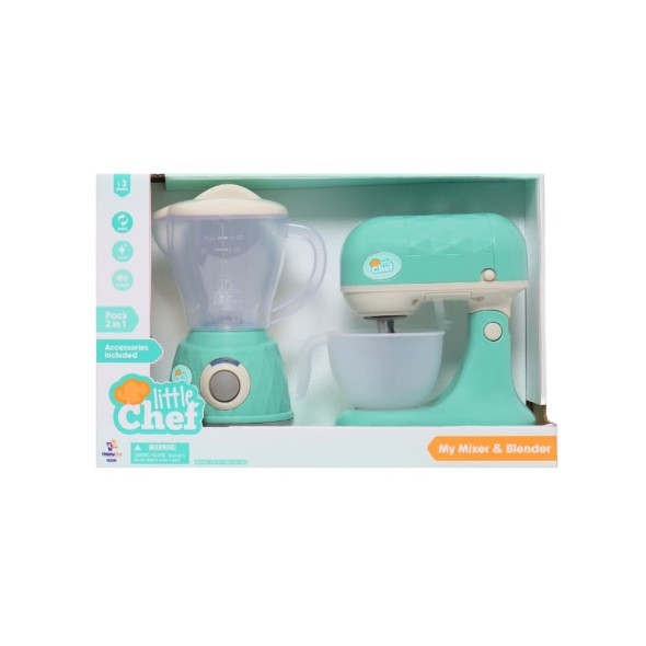 El Set de Batidora y Licuadora de Juguete Little Chef – My Mixer & Blender 2 en 1 (980046) es perfecto para que los niños disfruten del juego de roles mientras imitan actividades reales de cocina. Con un diseño moderno en color verde agua, este pack incluye una batidora y una licuadora, ambas con funciones interactivas que hacen el juego más realista y divertido.