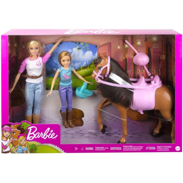 El set viene con un caballo con crin y cola suaves, además de una silla de montar doble, riendas y brida, permitiendo que ambas muñecas puedan montar juntas o turnarse. Es perfecto para crear historias de aventura, amistad y cuidado de los animales, fomentando el juego narrativo desde temprana edad. También conocido como Barbie Stacie Sisters on Horse Playset – Horse Riding Lessons Playset.